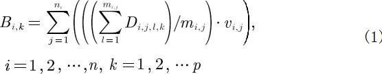 公式(1)用于计算第k个学生在第i个课程目标毕业要求指标点下“课程评价”评价方法下的评价得分Bi,k。其中,n为毕业要求指标点总数,p为学生总数,ni为支撑第i个毕业要求指标点的课程数,每门课程的支撑权重为vi,j(j)=1,2,...ni,支撑第i个毕业要求指标点的第j门课程有mi,j个教学目标支撑该指标点,第k个学生在上述课程目标下的评价结果为Di,j,l,k(l=1,2,...,mi,j) 。