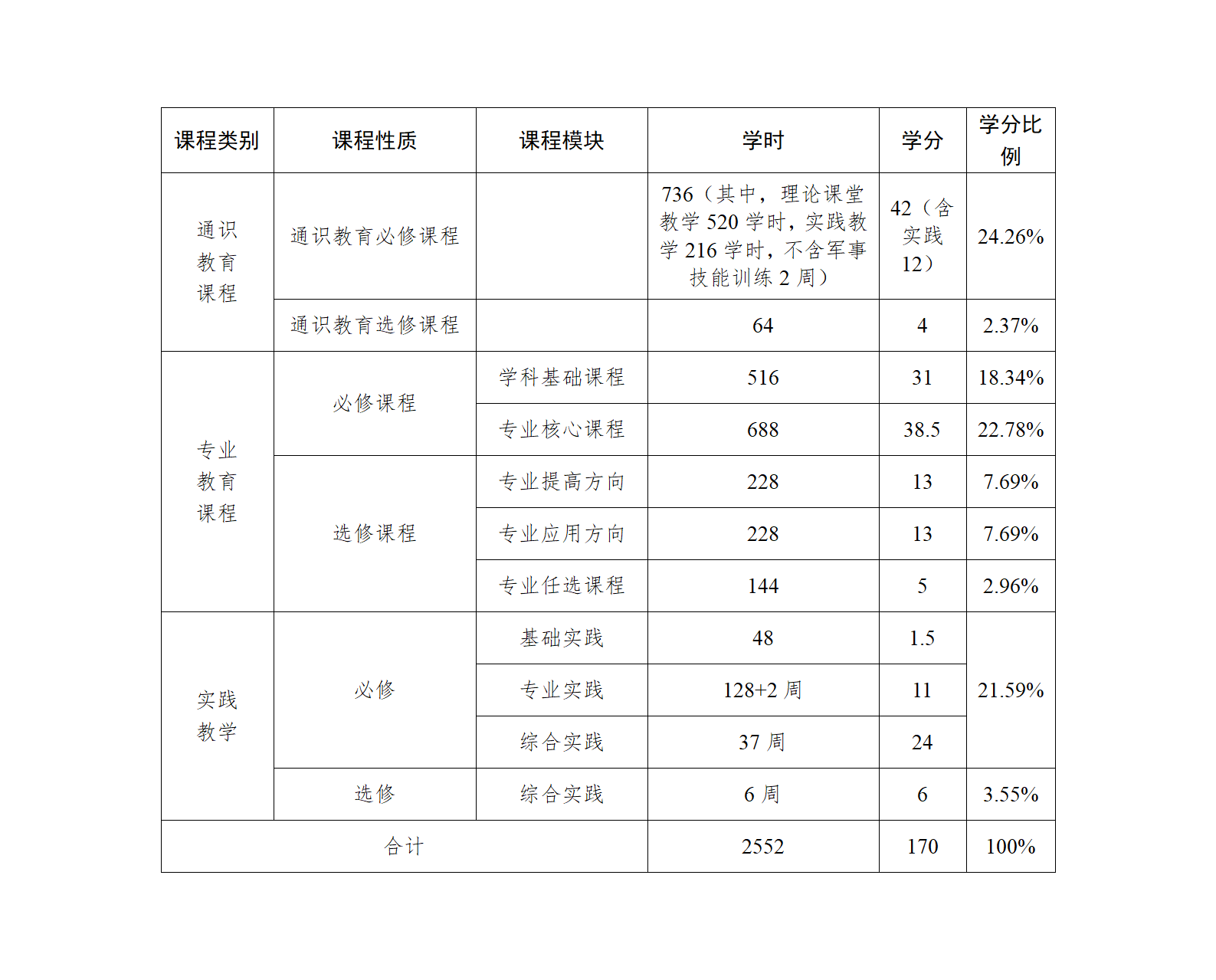 本专业标准学制为四年,学校实行学分制下的弹性学制。计划总学时为2552学时,总学分为170学分。允许学生在3~8内修完规定课程,修满规定学分,准予毕业。符合学位授予条件者,经校学位委员会审核通过,授予工学学士学位。