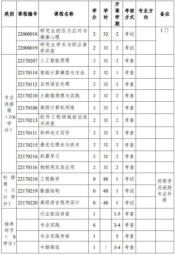 跨专业类别(领域) 或以同等学力考入的研究生必须补修《工程数学》、《数据结构》以及《高级语言程序设计》3 门课程。补修课程成绩必须合格但不计学分。