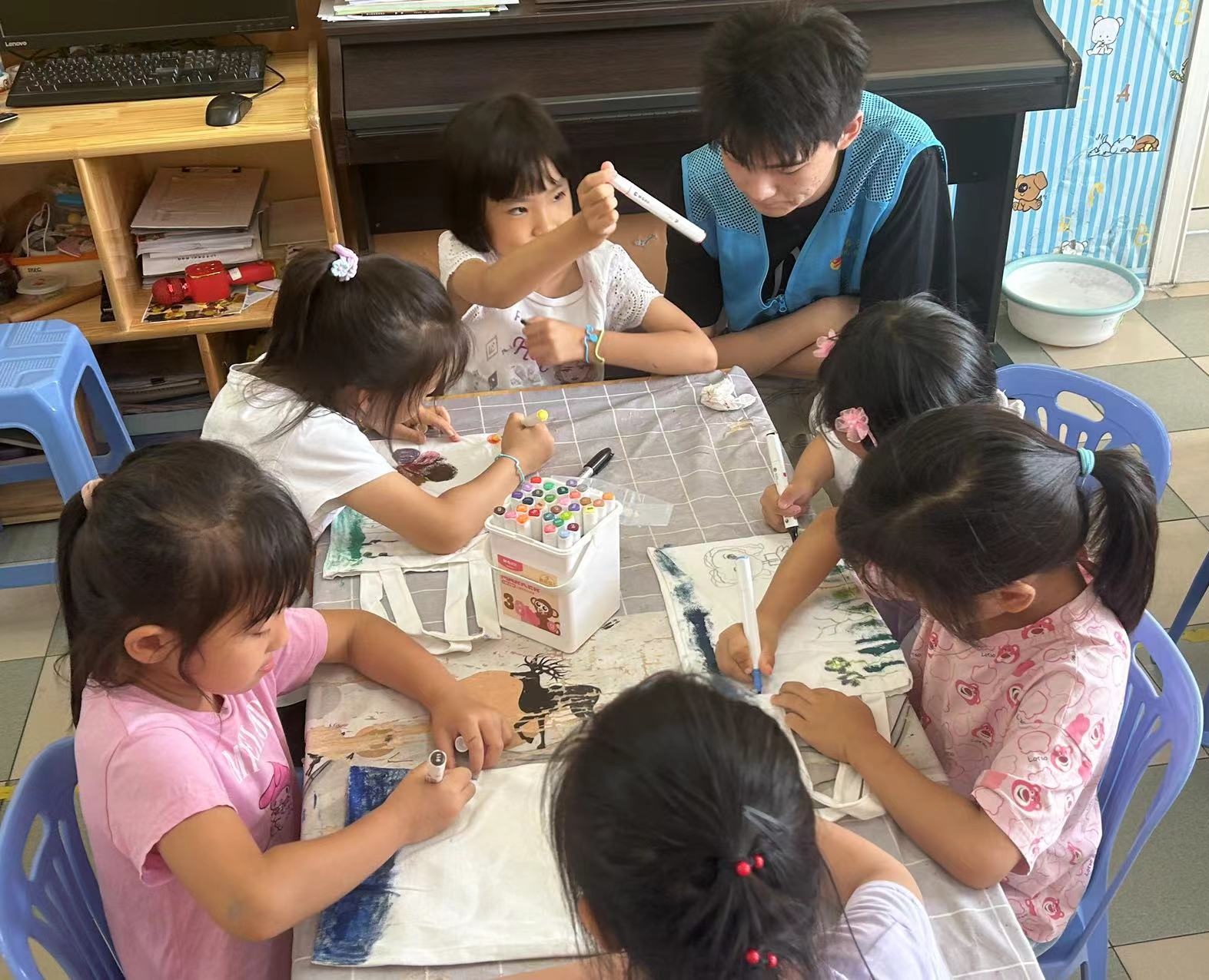 志愿者精心策划“旗帜知识小课堂”,通过图文并茂的PPT展示与生动有趣的讲解,带领孩子们深入了解国旗、队旗、团旗等旗帜的象征意义与历史背景。在互动问答环节中,孩子们积极参与,踊跃发言,展现出他们对国家、对集体的热爱与自豪。非洲鼓文化体验活动的引入,使孩子们不仅了解到非洲鼓的渊源历史,还亲身体验到其节奏与旋律的和谐之美。随着鼓声的节奏感逐渐增强,孩子们逐渐掌握了打鼓的基本技巧,并在合作中感受到团队的力量与音乐的魅力,不仅丰富音乐素养,也体验到不同文化的独特魅力。“彩绘手提包”活动将现场气氛推向高潮,在志愿者的鼓励与指导下,大家发挥想象力与创造力,在手提包上绘制出各种五彩斑斓的图案与场景,不仅锻炼孩子们的动手能力与艺术创造力,更让他们收获了满满的成就感与喜悦。从鲜艳的花朵到可爱的动物,再到充满童趣的家庭场景,每一件作品都充满了孩子们对生活的热爱与对未来的憧憬。