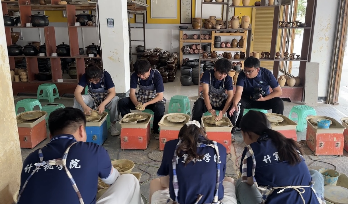 在参观产业园区后,实践团成员于非遗传承人的指导下,亲身体验花茂陶的制作流程。从揉泥、拉坯到上釉,队员们系统研习了包括十二道核心工序在内的传统技艺。尽管实践队员频频面临手法生疏、塑形失败等挑战,但在传承人的悉心点拨与示范下,每一位成员均克服困难,独立完成具有个人风格的陶艺作品。此次体验不仅深化实践队员对非遗技艺严谨性与艺术性的理解,更促使团队从财经视角深入思考:如何通过品牌化运营、产业链整合与互联网营销,通过财经知识提升非遗产品经济附加值,激活乡村特色资源,推动非遗文化价值向可持续经济价值有效转化,助力乡村产业振兴与高质量发展。