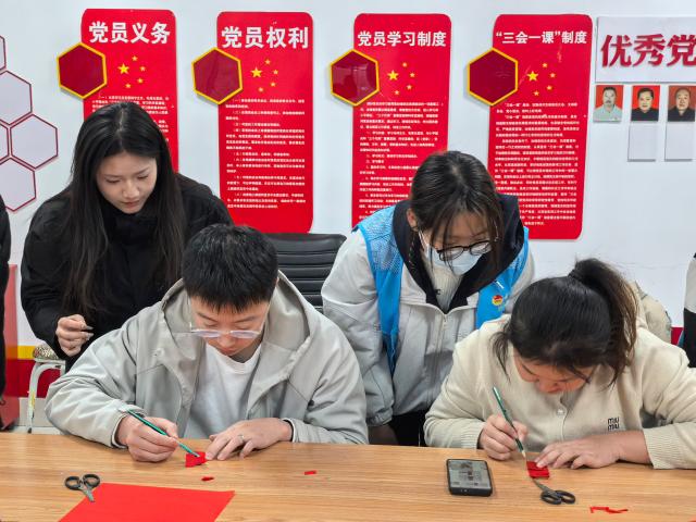 实践队员以通俗生动的语言,为居民们讲述了剪纸的悠久历史,从古代的民俗祭祀用途到如今的生活装饰,从南北流派的风格差异到吉祥纹样的文化寓意,让大家在聆听中感受剪纸艺术背后深厚的文化底蕴。随后,志愿者展示了寓意吉祥的福字窗花、灵动精巧的花鸟纹样、喜庆热闹的传统图案等多款经典剪纸作品。造型别致的作品引得居民们连连称赞,进一步点燃了居民动手体验的热情。实操环节中,实践队员选择了喜字、简单窗花等入门级作品作为教学重点,一步步示范标记关键折痕、勾勒简约线条、裁剪边角细节的步骤,并为社区居民们一对一答疑解惑,及时帮助他们纠正裁剪角度。居民们热情高涨,专注投入到创作中,手持剪刀在红纸上灵活游走,将原本普通的红纸渐渐变成了喜庆的喜字、精巧的窗花,既感受到动手实践的乐趣,也体悟到非遗技艺“于细微处见匠心”的独特魅力。