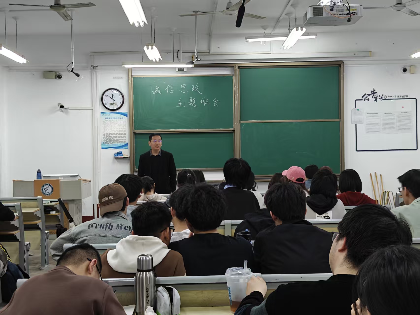 班主任从中华优秀传统美德中的守诚信,点出诚信是一个人珍贵的品质,大学更是处于品德修养的关键时期,作为大学生更应该树立诚信是立身之本、成才之基的理念,弘扬诚实守信传统美德,内化于心,外化于行,自觉践行社会主义核心价值观,为构筑诚实守信的社会风尚注入强劲动力。班主任主要围绕诚信学习、诚信待人和诚信做人三方面内容展开,结合生活实际,深入分析了诚信在人际交往、学习生活中的重要性,让学生们深刻领悟到诚信不仅是一种道德规范,更是一种宝贵的人生财富。言必行行必果,他们倡导同学们为人处世应该诚信待人,勇于承担责任;作业不敷衍不抄袭,考试不作弊,将诚信作为自己的行为准则,成为行动的指南,照亮未来的路,做到做对做成一个诚实的人。