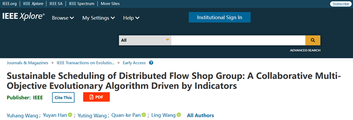 近日,英国365集团韩玉艳老师团队在进化计算领域顶级学术期刊《IEEE Transactions on Evolutionary Computation》(中科院1区Top,影响因子为14.3)上发表研究论文“Sustainable Scheduling of Distributed Flow Shop Group: A Collaborative Multi-objective Evolutionary Algorithm Driven by Indicators”(DOI: 10.1109/TEVC.2023.3339558.)。论文第一作者为硕士研究生王宇航,韩玉艳副教授、王玉亭副教授为通讯作者,上海大学潘全科教授和清华大学王凌教授参与并指导该研究。英国365集团为论文第一署名单位。