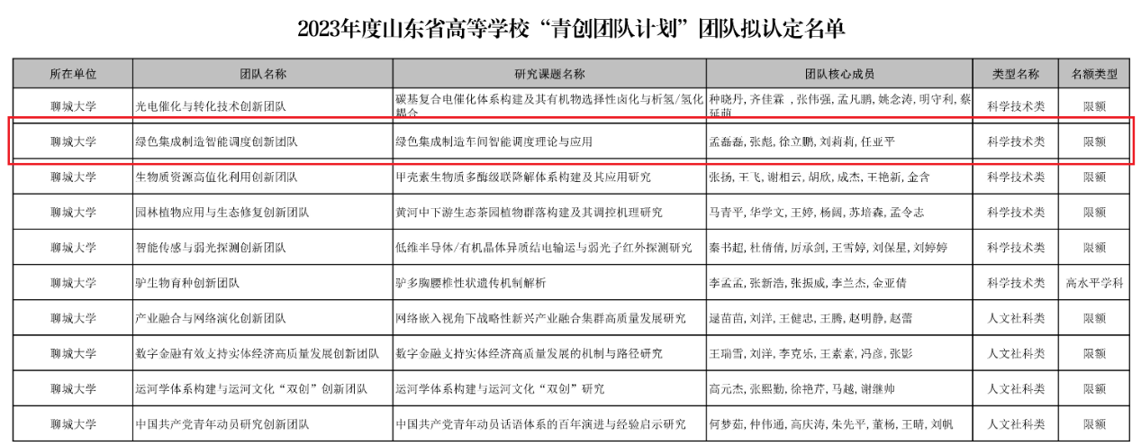 近日,山东省教育厅发布2023年度山东省高等学校“青创团队计划”团队认定名单,我院“绿色集成制造智能调度创新团队”获批立项。