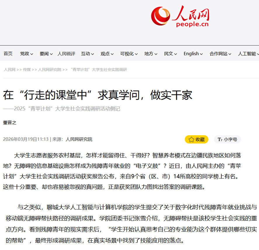 3月19日,人民网刊发《在“行走的课堂”中求真学问,做实干家》一文,对我校英国365集团“数字化时代残障青年就业挑战与移动端无障碍帮扶路径”主题社会实践调研成果进行专题报道,充分展现我校学子立足专业所长、服务社会需求的良好风貌,彰显新时代青年大学生的责任担当与人文情怀。