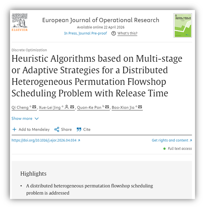 近日,我院研究生程琦在导师荆雪蕾、贾保先的指导下,以第一作者身份在国际顶级期刊《European Journal of Operational Research》(简称EJOR)上发表了题为“Heuristic Algorithms based on Multi-stage or Adaptive Strategies for a Distributed Heterogeneous Permutation Flowshop Scheduling Problem with Release Time”的高水平学术论文。该成果标志着我院在复杂生产调度优化领域的研究取得了重要突破。